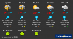 28.05 – Vransira me të reshura shiu që nga orët e mëngjesit, që shoqërohen edhe me bubullima gjatë ditës. Të reshurat pritet të pushojnë deri në mbrëmje.29.05 – Kryesisht me diell dhe jo aq ngrohtë. Herë herë me vransira kalimtare, por pa mundësi për të reshura.