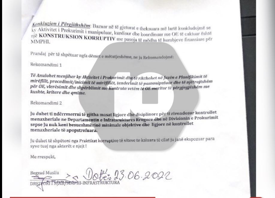 “Ju duhet të ndërmerrni të gjitha masat ligjore dhe disiplinore për ti rivendosur kontrollet menaxheriale në Departament të Infrastrukturës rrugore dhe në Divizionin e Prokurimit, sepse Ju nuk keni besueshmërinë minimale objektivë dhe ligjore në kontrollet menaxheriale të apostrofuar”, thuhet në këtë raport i cili mbanë vulën e datës 23 qershor 2022.