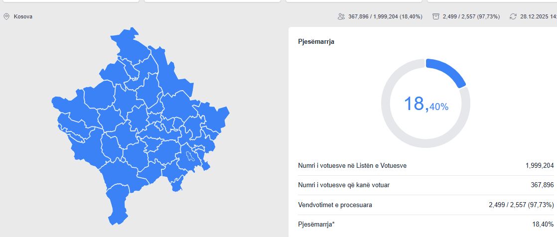 Bazuar në të dhënat e përditësuara nga Komisioni Qendror i Zgjedhjeve, pjesëmarrja e qytetarëve në përqindje është 18.40, raporton Periskopi.