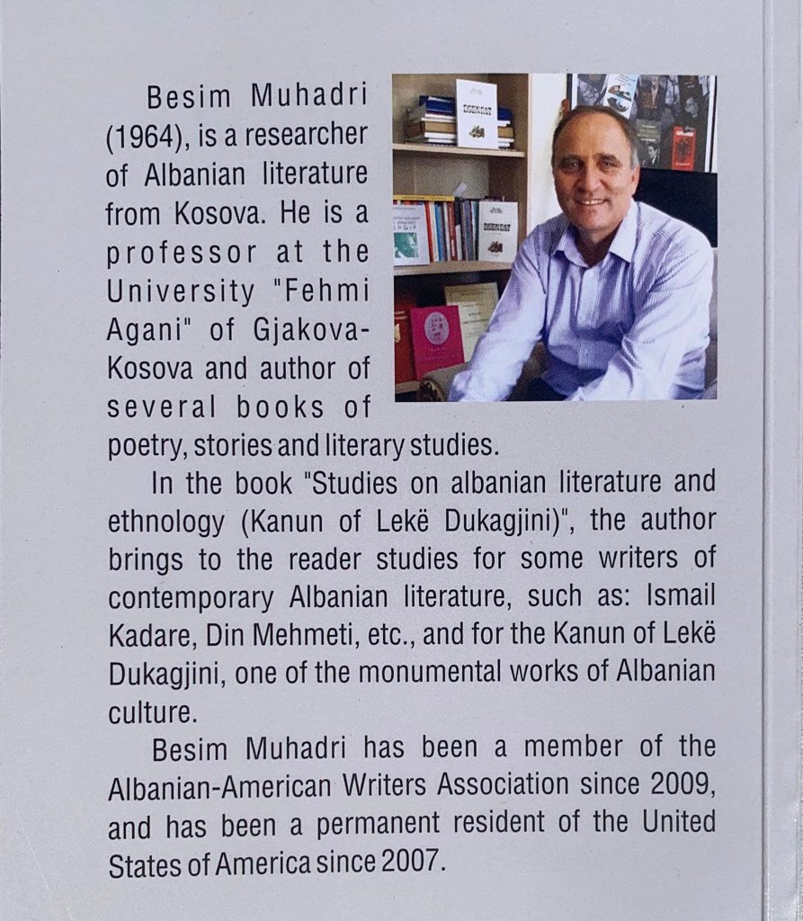 Këto ditë në Nju Jork, Shtëpia Botuese ADRIATIC PRESS, ka botuar në gjuhën angleze librin “STUDIES ON ALBANIAN LITERATURE AND ETHNOLOGY (Kanun of Lekë Dukagjini” të profesorit të Fakultetit të Filologjisë të Universitetit “F. Agani” të Gjakovës, Prof. Asoc.Dr. Besim Muhadri, i cili është edhe anëtar i Shoqatës së Shkrimtarëve Shqiptaro-Amerikanë.