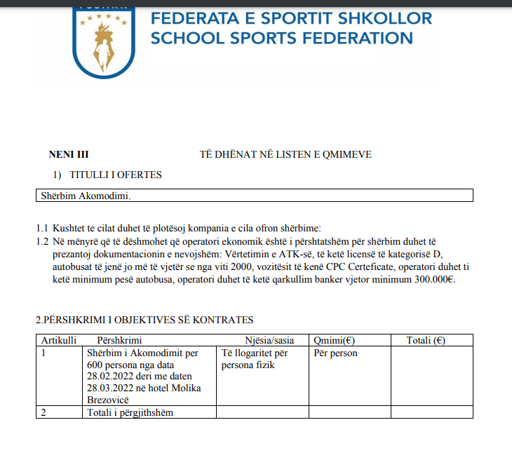 Sipas tenderit që OJQ Federata e hapi, mbetet dilemë dhe detaj interesant se si aty rekomandohet se në cilin hotel duhet të shkojnë nxënësit. Pra, hoteli për akomodim, me emër i rekomandohet kompanisë fituese të tenderit.
