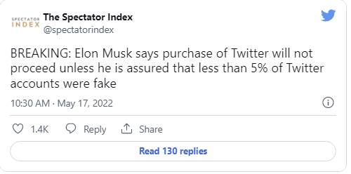 “Elon Musk thotë se blerja e Twitter nuk do të vazhdojë derisa nuk sigurohet se më pak se 5% e llogarive në Twitter ishin false”, shkruan “The Spectator Index”.