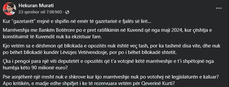 Deklarata e ministrit në detyrë Hekuran Murati, sipas së cilës partitë opozitare në legjislaturën e kaluar kishin refuzuar të votonin ratifikimin e marrëveshjes për 90 milionë euro hua pa kamatë nga Banka Botërore, nuk qëndron. Kjo pasi marrëveshja nuk u ratifikua për shkak të mungesës së kuorumit, e jo për shkak të votimit kundër nga partitë opozitare, nga të cilat vetëm LDK nuk mori pjesë në votim, ndërsa PDK dhe AAK votuan pro.