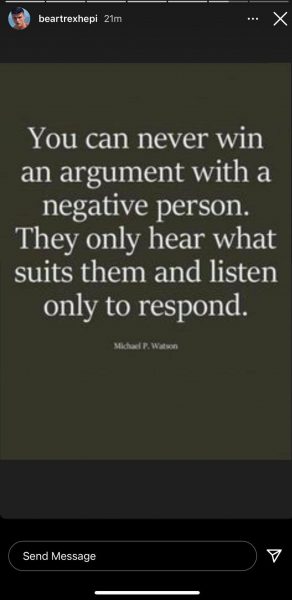 “Nuk mundesh asnjëherë të fitosh një argument me një person negativ. Ata dëgjojnë vetëm atë që iu përshtatet atyre dhe dëgjojnë vetëm për t’u përgjigjur”, thuhet në fotografinë që Bearti ka shpërndarë në Instagram.