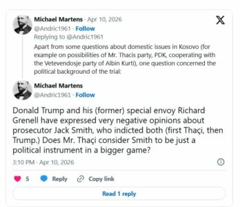 “Donald Trump dhe i dërguari i tij (ish) i posaçëm Richard Grenell kanë shprehur opinione shumë negative për prokurorin Jack Smith, i cili ngriti aktakuza ndaj të dyve (fillimisht ndaj Thaçit, pastaj ndaj Trumpit). A e konsideron z. Thaçi Smith-in thjesht si një instrument politik në një lojë më të madhe?”
