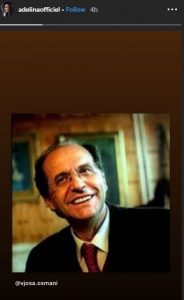 E jo foto është pikërisht nga postimi i Vjosa Osmanit që ka bërë për Rugovën, kështu Adelina duke e ndarë me ndjekësit e saj, dhe ka etiketuar postimin e Osmanit për të treguar se ajo pajtohet me fjalët që kandidatja për kryeministre ka thënë për Presidentin e ndjerë.