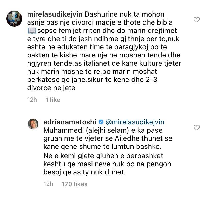Në një postim të ri në Instagram krah dashurisë së saj, një komentuese i tha: “Nuk është në edukatën time të paragjykoj, port ë paktën të kishe marrë një në moshën tënde dhe ngjyrën tënde, as italianët që kanë kulturë tjetër nuk marrin moshë të re, por marrin moshat përkatëse.