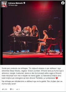 Sonte jam mrekullu me shfaqjen “Te vdekurit mbajne zi per atdheun” nga shkrimtari Beqir Musliu, regjisor: Erson Zymberi. M’kane lane pa fryme loja e aktoreve, kangte, kostumet, skena e deri te koncepti edhe regjia e Ersonit. Kete mbramje kom me e mbjate ne mend gjate! Ju falenderoj krejtve amo bash krejtve per energjine qe keni dhone! Perfekte, ju lumteeeeee