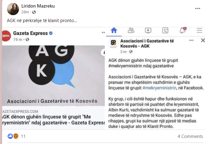 Ata kanë shpërndarë reagimin e Asociacionit të Gazetarëve të Kosovës dhe kanë sulmuar ashpër duke thënë “Janë bërë bashkë i gjithë kazani mediatik kundër grupit”.