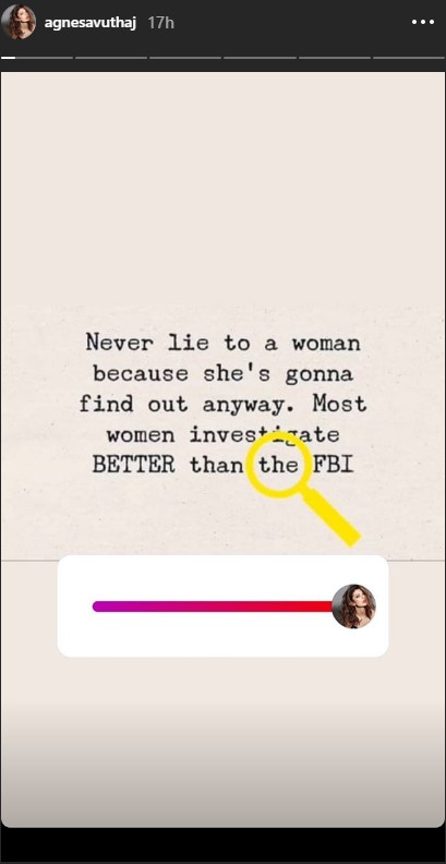 “Kurrë mos e gënje ndonjë femër sepse do ta zbulojë një formë apo tjetër. Shumica e femrave dinë të investigojnë më mirë se FBI”, ka shkruar ajo në një storie në Instagram.