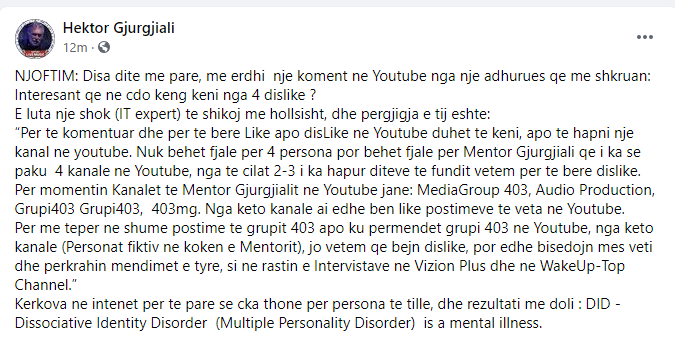 “Per te komentuar dhe per te bere Like apo disLike ne Youtube duhet te keni, apo te hapni nje kanal ne youtube. Nuk behet fjale per 4 persona por behet fjale per Mentor Gjurgjiali qe i ka se paku 4 kanale ne Youtube, nga te cilat 2-3 i ka hapur diteve te fundit vetem per te bere dislike. Per momentin Kanalet te Mentor Gjurgjialit ne Youtube jane: MediaGroup 403, Audio Production, Grupi403 Grupi403, 403mg. Nga keto kanale ai edhe ben like postimeve te veta ne Youtube.