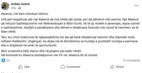 Azemi ka shprehur në Facebook indinjatën ndaj AAK-së, duke thënë se “Në komunat ku Aleanca bashkëpunon me VV-në, Aleanca do të shuhet”.