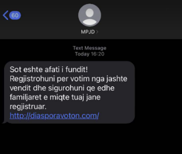 Regjistrohuni për votim nga jashtë vendit dhe sigurohuni që edhe familjarët e miqtë e juaj janë regjistruar”, thuhet në mesazhet e dërguara nga MPJD.