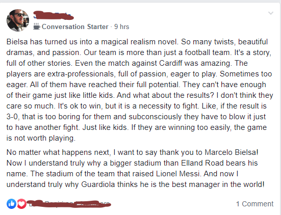 S’ka rëndësi çka ndodh në vazhdim, dua t’i them falemnderit Marcelo Bielsas! Tash mund ta kuptoj përnjëmend pse një stadium më i madh se Elland Road mban emrin e tij. Stadiumi i ekipit që rriti Lionel Messin. Dhe tash mund ta kuptoj përnjëmend pse Guardiola mendon që Bielsa është trajneri më i mirë në botë!”