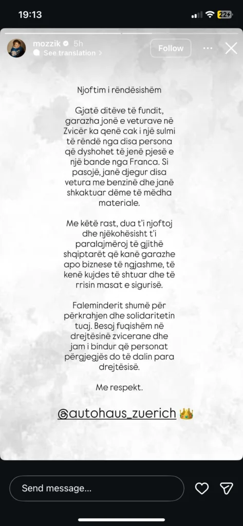 “Gjatë ditëve të fundit, garazha jonë e veturave në Zvicër ka qenë cak i një sulmi të rëndë nga disa persona që dyshohet të jenë pjesë e një e një bande nga Franca.Si pasojë, janë djegur disa vetura me benzinë dhe janë shkaktuar dëme të mëdha materiale. Me ketë rast, dua t’i njoftoj dhe njëkohësisht t’i paralajmëroj të gjithë shqiptarët që janë garazha apo biznese të ngjajshme, të kenë kujdes të shtuar dhe të rrisin masat e sigurisë”, ka shkruar Mozzik.
