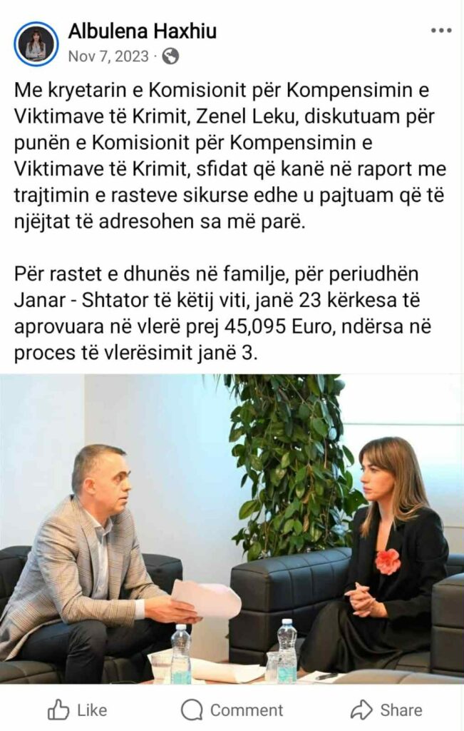 Leku, ishte emëruar në krye të Komisionit për Kompensim të Viktimave të Krimit, në janar të vitit 2023, nga vetë bashkëshortja e Keasniqit, Albulena Haxhiu.
