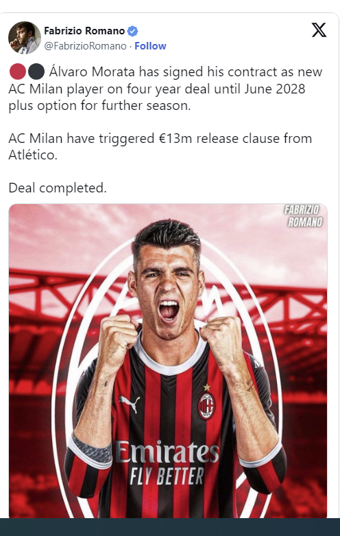 Álvaro Morata ka nënshkruar kontratën e tij si lojtar i ri i AC Milan, me një marrëveshje katërvjeçare deri në qershor 2028.