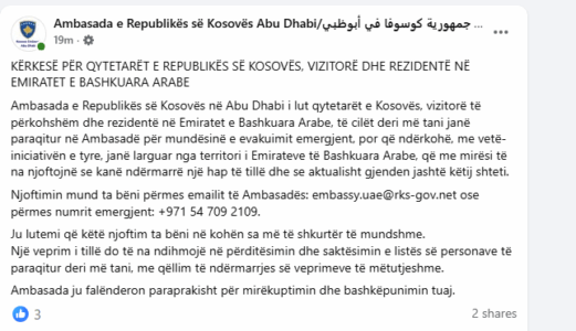 Ambasada e Republikës së Kosovës në Abu Dhabi përmes një njoftimi për media ka kërkuar nga qytetarët e Kosovës të cilët kanë qenë në Emirate Arabe dhe janë larguar me vetë-iniciativë, ta lajmërojnë Ambasadën.
