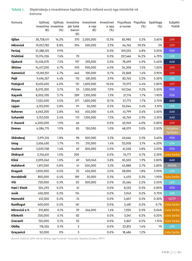 Analiza e GAP tregon se ndarja e investimeve nuk është plotësisht proporcionale me numrin e popullsisë apo sipërfaqen territoriale të komunave.