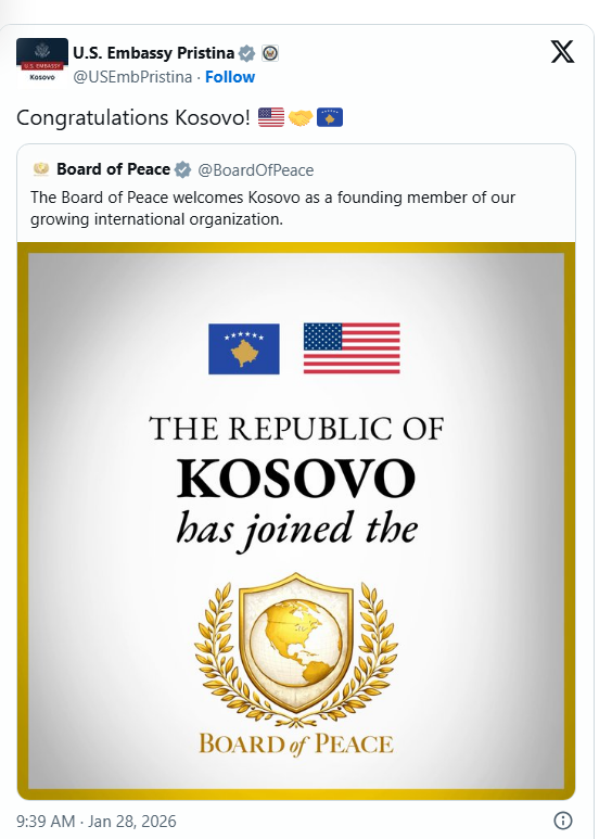 Duke e shpërndarë postimin e Bordit të Paqes, që i uroi Kosovës mirëseardhje në organ, Ambasada e SHBA-së shkroi: “Urime Kosovë”.