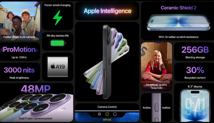 Në brendësi, çipi i ri A19 sjell një motor ekrani të riprojektuar, një motor neural me 16 bërthama, një CPU me 6 bërthama dhe një GPU me 5 bërthama. I kombinuar me rritjen e bandwidth-it të memories, Apple pretendon se është 20 përqind më i shpejtë se iPhone 16.