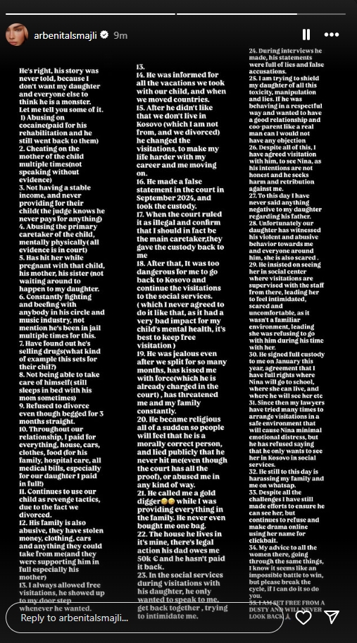 Në këtë rrëfim të gjatë, Arbenita flet për abuzime, dhunë fizike dhe psikologjike, mungesë mbështetjeje, manipulime ligjore dhe presione të vazhdueshme që thotë se ka përjetuar gjatë dhe pas marrëdhënies së tyre.