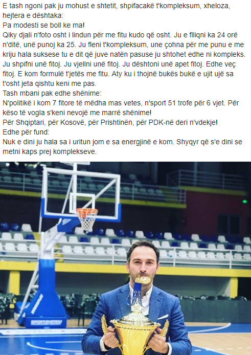 Stavileci është kryetar i Prishtinës, dhe vendosi ta linte modestinë anash për t’i numëruar ‘sukseset’ e tij. E çka arriti Prishtina? U bë kampione e Kosovës në basketboll duke e mposhtur Rahovecin. Liga e Kosovës në basketboll është tmerrësisht e dobët dhe Prishtina s’e ka pasë asnjëherë të zorshme që ta fitonte.