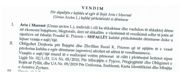 Dje u raportua se një dikaster i Qeverisë së Kosovës kishte marrë vendim që ta vriste z.Ari i Murrmë nga Prizreni, pasi ky i fundit thuhet të ketë shkaktuar dëme në ekonomi bujqësore e blegtorale dhe se rrezikonte jetën e njerëzve të një fshati. Nuk dihet nëse ka fakte për një gjë të tillë.