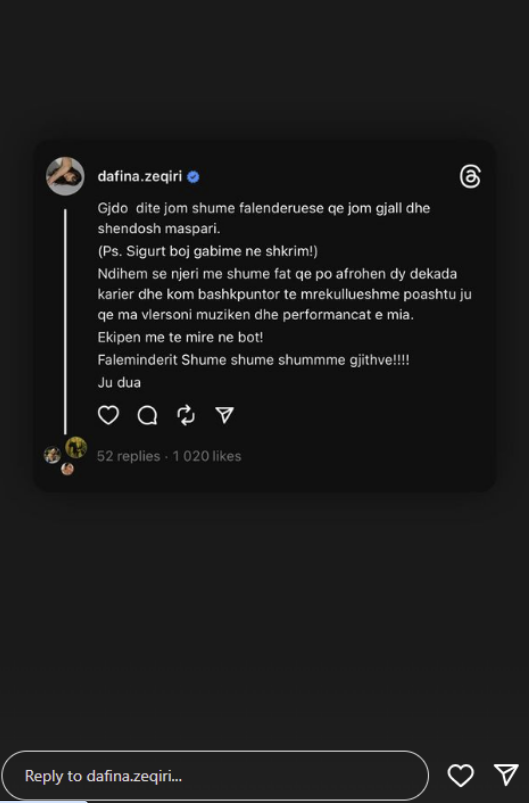 Me anë të një postimi në ‘Threads’, 35-vjeçarja ka falënderuar të gjithë për përkrahjen.