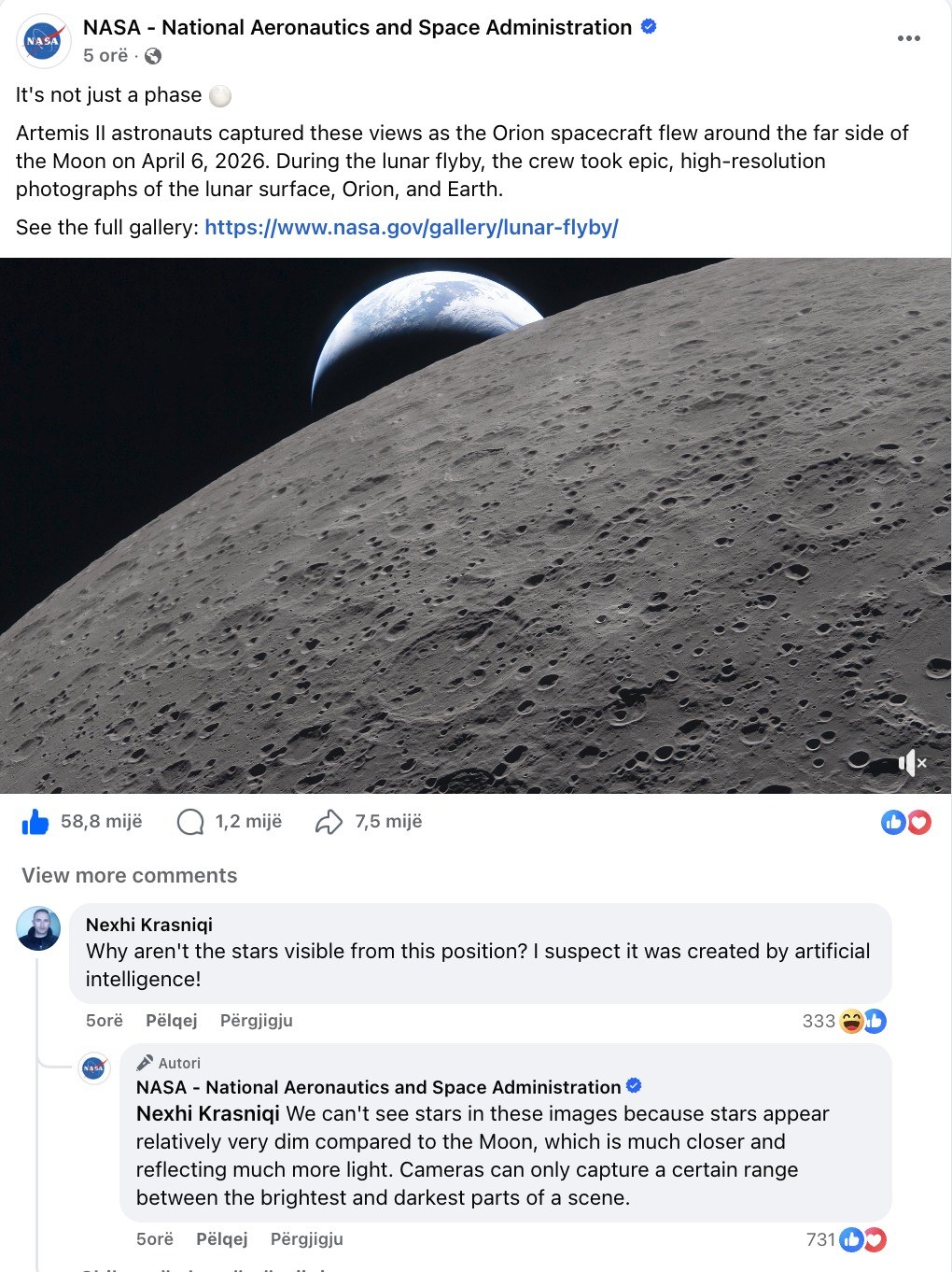 “Nexhi Krasniqi, nuk mund të shohim yje në këto imazhe sepse yjet duken relativisht shumë të zbehtë krahasuar me Hënën, e cila është shumë më afër dhe pasqyron shumë më shumë dritë. Kamerat mund të kapin vetëm një gamë të caktuar midis pjesëve më të ndritshme dhe më të errëta të skenës”, i është përgjigjur NASA.