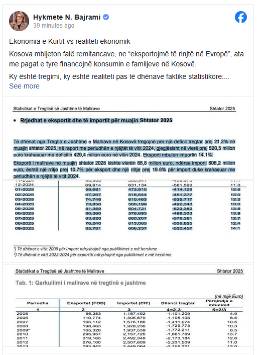 “Ky është tregimi, ky është realiteti pas të dhënave faktike statistikore:Sipas Agjencisë së Statistikave të Kosovës, deficiti tregtar për janar-shtator 2025 është mbi 5.4 miliardë euro – po thellohet”.