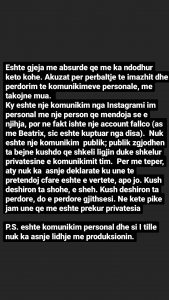 Në këtë pikë thotë se i është prekur privatësia, më poshtë postimi i plotë.