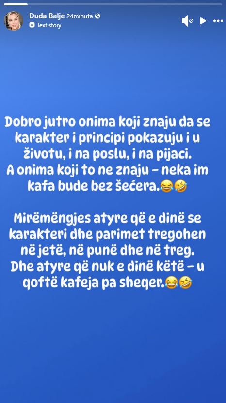 “Mirëmëngjes atyre që e dinë se karakteri dhe parimet tregohen në jetë, në punë dhe në treg. Dhe atyre që nuk e dinë këtë – qoftë kafeja pa sheqer”, ka shkruar Balje./Periskopi/