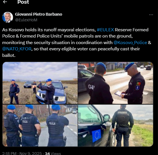 “Ndërsa Kosova po zhvillon raundin e dytë të zgjedhjeve për kryetarë komunash, patrullat mobile të Njësive të Policisë së Formuar dhe të Policisë së Formuar Rezervë të EULEX janë në terren, duke monitoruar situatën e sigurisë në bashkëpunim me Policinë e Kosovës dhe KFOR, në mënyrë që çdo qytetar me të drejtë vote të mund ta ushtrojë lirshëm dhe paqësisht të drejtën e tij për të votuar”, është thënë nga Barbano./Periskopi/