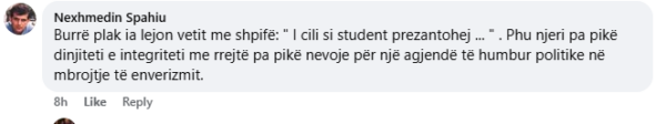 ‘‘Burrë plak ia lejon vetit me shpifë: ” I cili si student prezantohej … ” . Phu njeri pa pikë dinjiteti e integriteti me rrejtë pa pikë nevoje për një agjendë të humbur politike në mbrojtje të enverizmit’’, ka shkruar Spahiu.