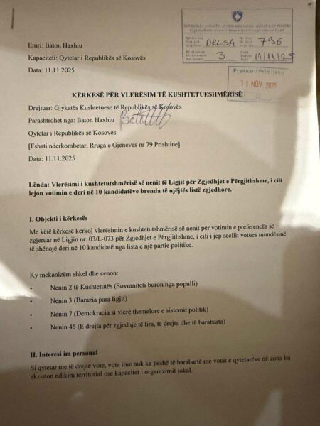 Gazetari dhe publicisti kosovar, Baton Haxhiu, përmes një shkrese zyrtare i është drejtuar Gjykatës Kushtetuese të Republikës së Kosovës përmes së cilës ka kërkuar shfuqizimin e dispozitës ligjore që lejon një person të votojë deri në dhjetë kandidat për deputetë.