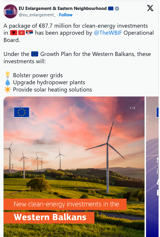 Bashkimi Evropian në kuadër të Planit të Rritjes ka njoftuar se sot ka aprovuar një paketë prej 87.7 milionë eurosh për investime në energjie të pastër për Shqipërinë, Malin e Zi dhe Serbinë, shkruan Express, transmeton Periskopi.