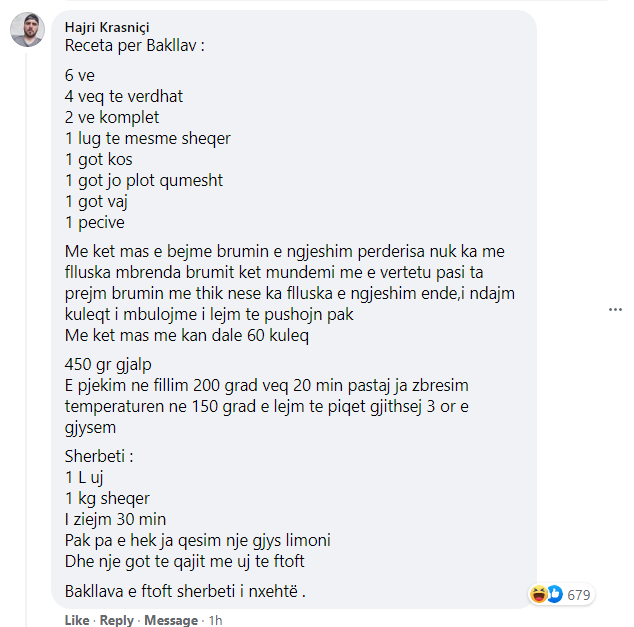 Në një prej lajmeve të Periskopit sot, ku raportohej se një grua në Ferizaj ka ushtruar dhunë fizike ndaj burrit, një prej komentuesve të parë publikoi një recetë për bakllavë.