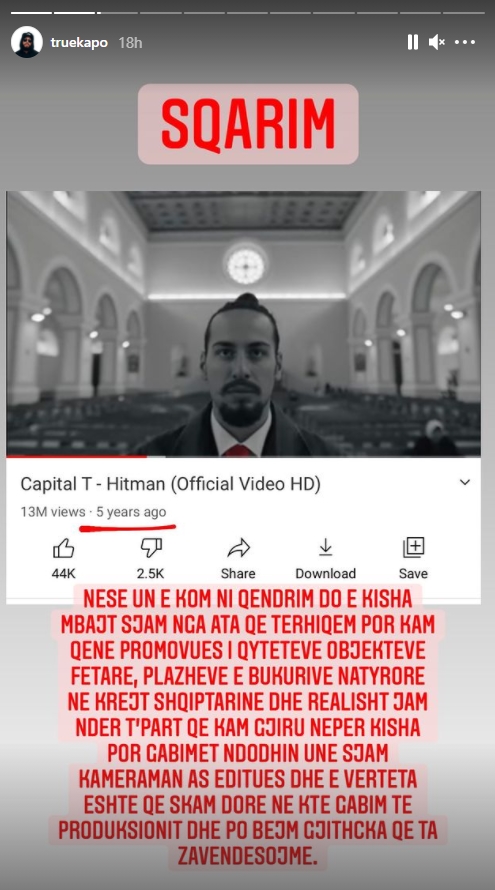 “Sqarim: Nëse unë e kam një qëndrim do e kisha mbajtur, s’jam nga ata që tërhiqem por kam qenë promovues i qyteteve objekteve fetare, plazheve e bukurive natyrore në krejt Shqiptarinë dhe realisht jam ndër të parët që kam xhiruar nëpër kisha. Por gabimet ndodhin dhe unë s’jam kameraman as editues dhe e vërteta është që s’kam dorë në këtë gabim të produksionit dhe po bëjmë gjithçka që ta zëvendësojmë”, ka shkruar në InstaStory reperi, emri i vërtetë i të cilit është Trim Ademi.