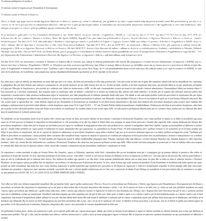 Në shkresë pretendohet për një kontroll të plotë mbi proceset brenda Arkivave, nga prokurimi deri te konkurset.