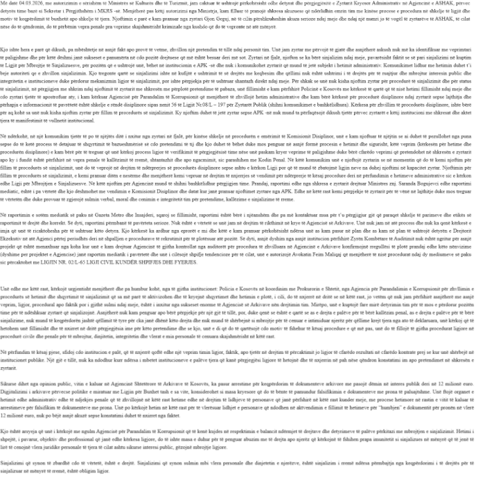 Ndër të tjera, ai i ka bërë thirrje Policisë së Kosovës në koordinim me Prokurorin e Shtetit, Agjencisë për Parandalimin e Korrupsionit për zhvllimin e procedurës së hetimit dhe shqyrtimit të sinjalizimit që sa më parë të aktivizohen dhe të kryejnë shqyrtimet dhe hetimin e plotë.