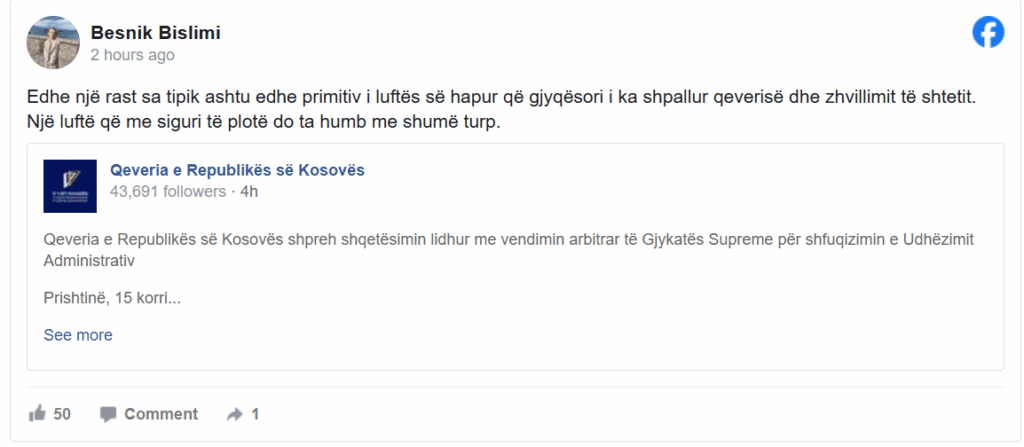 Bislimi akuzoi hapur gjyqësorin për një “luftë të hapur ndaj qeverisë” dhe e ka cilësuar vendimin e Supremes si “rast tipik dhe primitiv” të kësaj lufte.