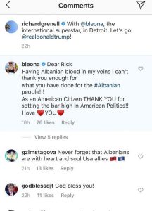 “I dashur Rick, duke pasur gjak shqiptar në venat e mia, unë nuk mund të të falënderoj mjaftueshëm për atë që ti ke bërë për popullin shqiptar. Si qytetare amerikane, faleminderit për vendosjen e standardeve të larta në politikën amerikane. Të dua”, ka qenë komenti i Qerretit në foton e publikuar nga Grenell.