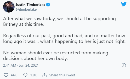 “Pas të gjithave që kemi dëgjuar sot, ne të gjithë duhet të mbështesim Britney Spears. Pavarësisht nga e kaluara jonë, qoftë e mirë apo e keqe, ajo që po i ndodh asaj nuk është e drejtë. “Ne kurrë nuk duhet t’i mohojmë asnjë gruaje të drejtën të vendosë për trupin dhe jetën e saj”, shkroi Timberlake në Twitter.