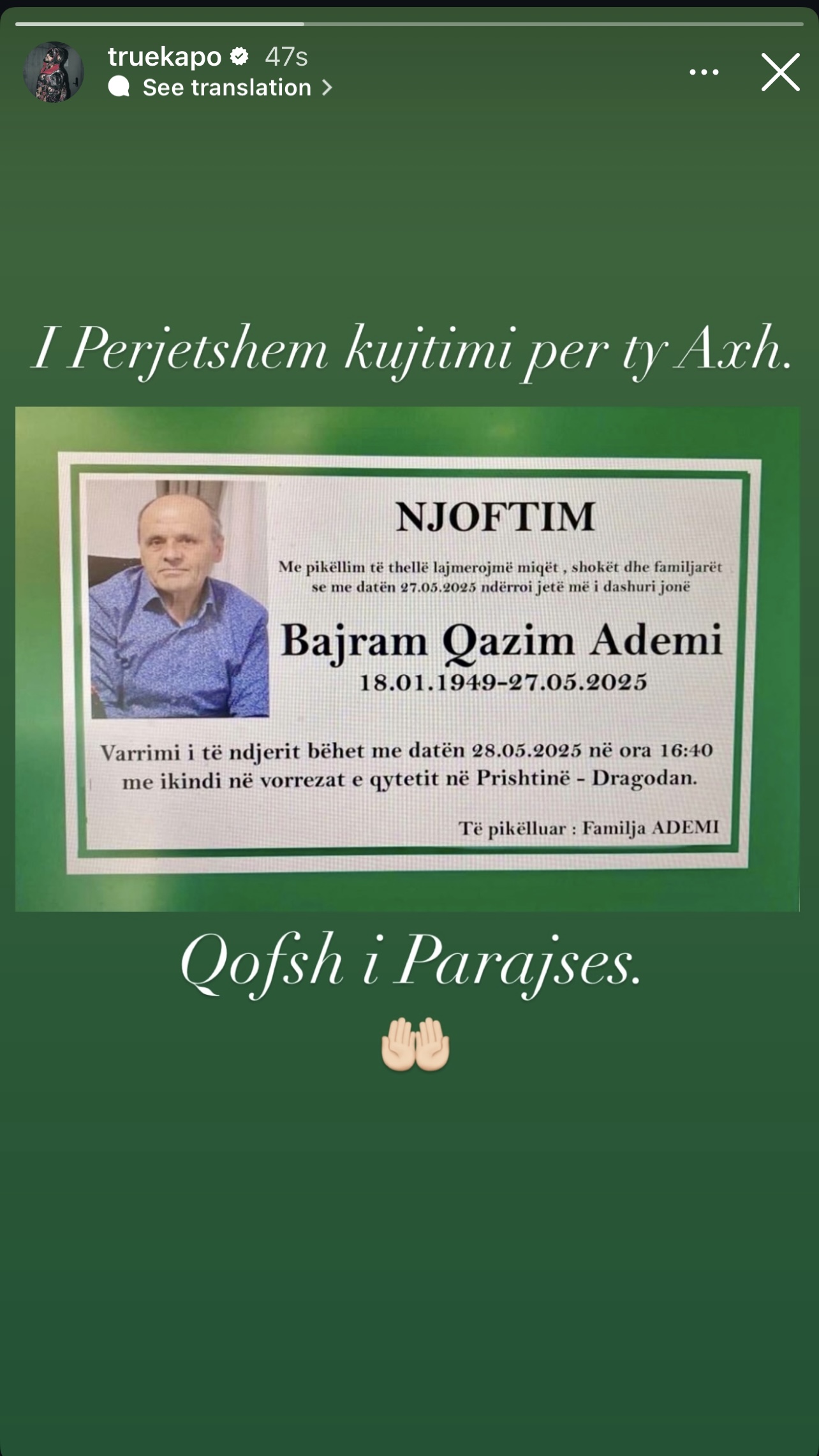 “I përjetshëm kujtimi për ty Axh. Qofsh i Parajsës” – shkroi ai, duke ndarë një fotografi të njoftimit mortor të të ndjerit.
