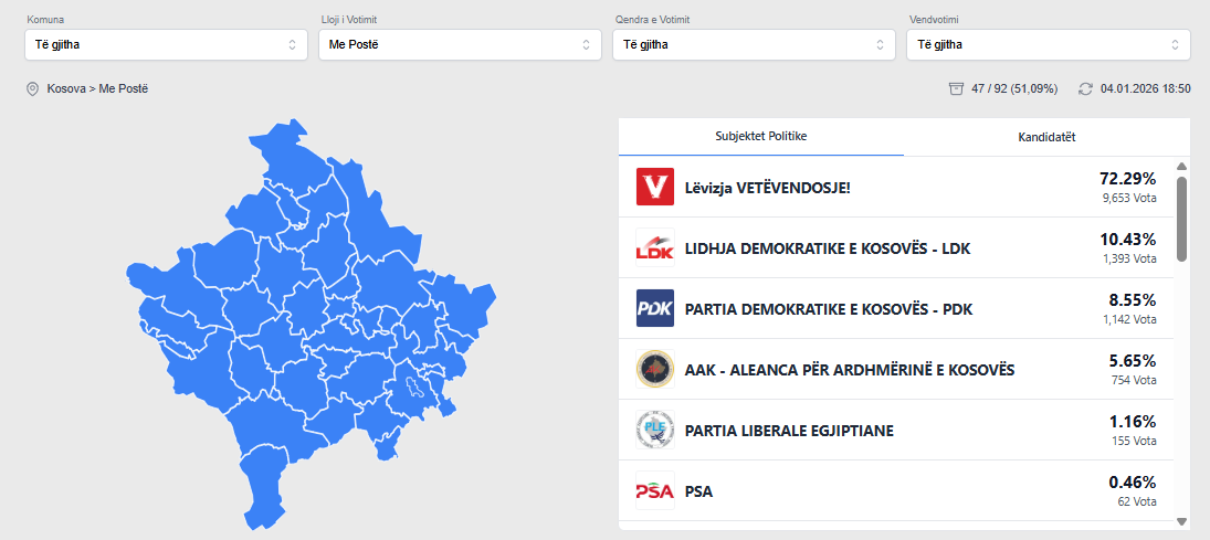 Numërohen mbi 50% e votave me postë, Vetëvendosje mbi 72%