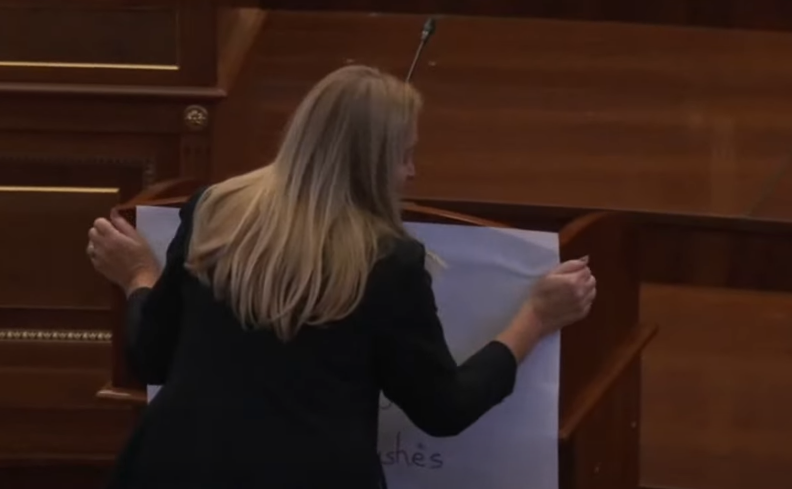 “Fitore Pacolli 200 mijë €, gratë e Krushës 0€”, Time Kadrijaj me pankartë në Kuvendin e Kosovës