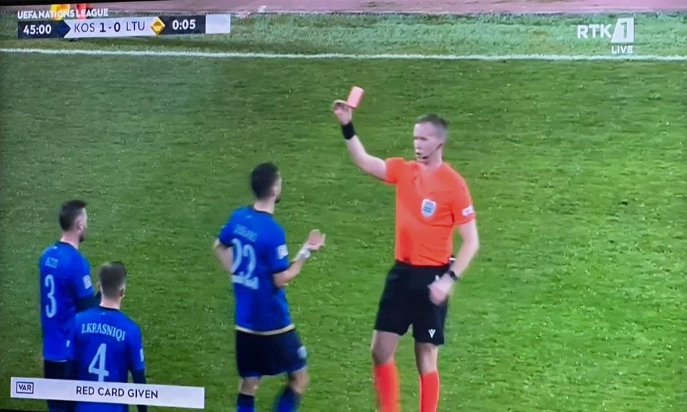 Gjyqtari kontravers i takimit Kosovë – Lituani, e shikon VAR-in dhe e ndëshkon me të kuq Jasharin