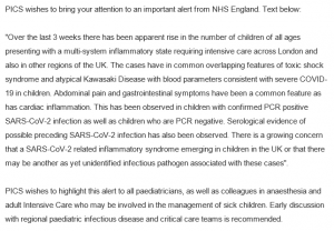Të dielën, Shoqata e Kujdesit Pediatrik në Mbretërinë e Bashkuar (PICS) paralajmëroi për një rritje të vogël të numrit të rasteve të fëmijëve me sëmundje kritike, disa që kishin testuar pozitivisht për COVID-19, duke paraqitur “tipare të sindromës së shokut toksik dhe sëmundjes atipike ‘Kawasaki’ me parametra të gjakut”.