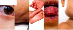 Simptomat përfshijnë një temperaturë të lartë që zgjat pesë ditë ose më gjatë, së bashku me një skuqje në qafë, buzë të thata e të plasaritura, gishtërinj dhe sy të kuq.